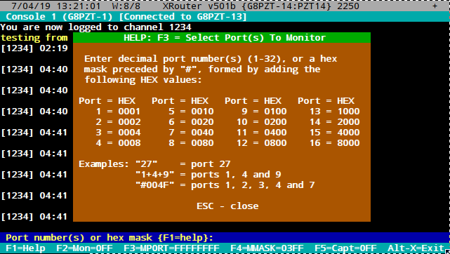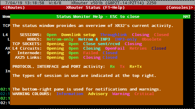 Some of XRPi's windows have help windows which are activated by pressing <F1>. These are shown below: These are the windows in version 501b. Later versions may differ. Sysop Chat Help:![]() Nodes Monitor Help:![]() Routes Monitor Help:![]() Staus Window Help:![]() Console Help:![]() Help for Console MPORT (<F3>):![]()